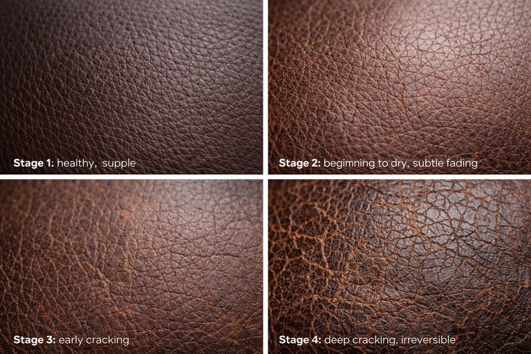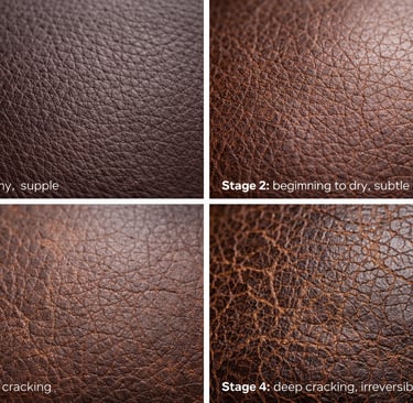 New leather from the factory contains natural oils and conditioning agents that keep it supple and soft. The problem is that those oils don't last forever. Heat pulls them out. And once the moisture is gone and the fibers start to dry out, the leather begins to contract and crack — a process that, once it's done, cannot be fully reversed.